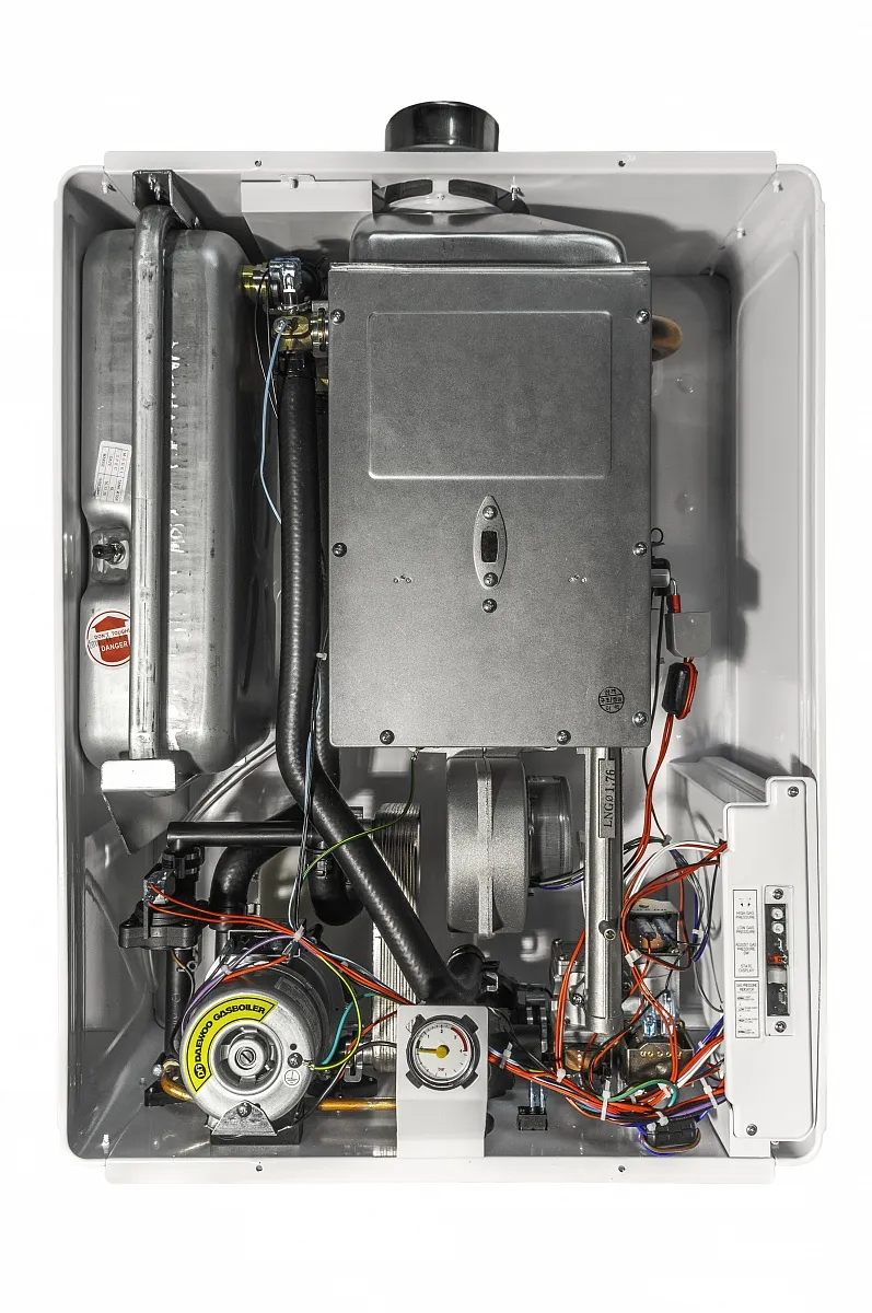 В средства системы безопасности входят высокая огнеупорность корпуса, двойная защита от замерзания, от задувания пламени, от залипания лопастей насоса, от закипания, а также тройная защита от перегрева. Котел комплектуется датчиком утечки газа.